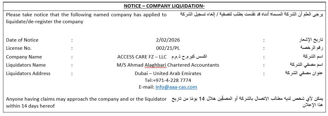 اشعار بخصوص تصفية - اكسس كير م.ح ذ.م.م