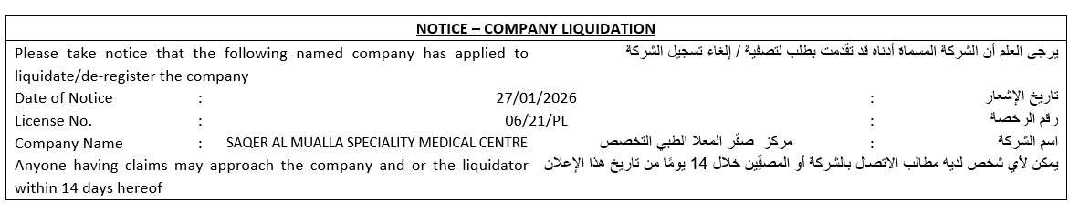 اشعار بخصوص تصفية - مركز الدكتورة سبا الطبي م.ح ذ.م.م